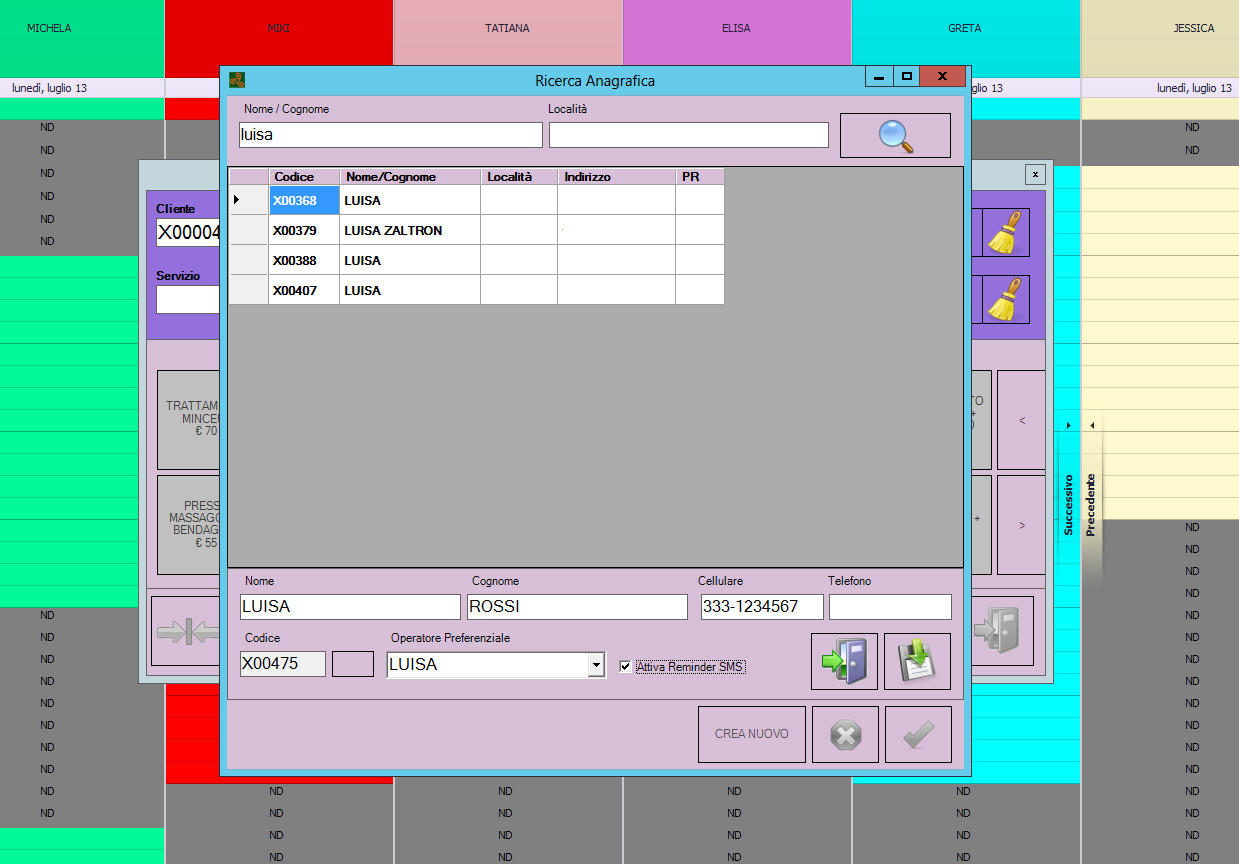 - Nuova gestione delle prenotazioni, in fase di ricerca della cliente durante la prenotazione sarà ora possibile codificare un nuovo cliente solamente inserendo nome, cognome, numero di telefono e operatore preferenziale