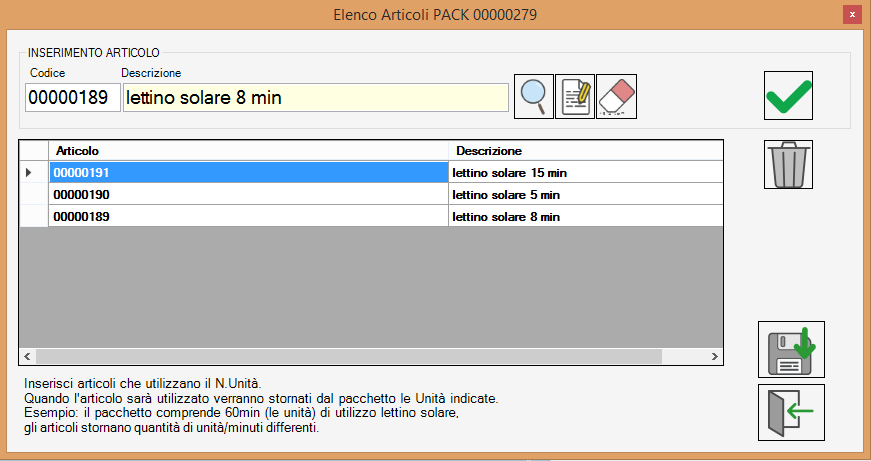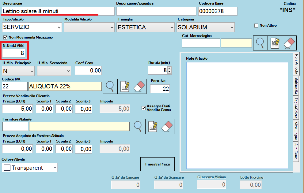 Dovrà essere indicaro il “Numero di Unità”quando staremo creando un abbonamento, in questo caso andranno inseriti solo quegli articoli che riguardano minuti di prestazione (es. massaggi, lettini solari).
