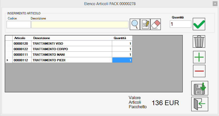 comparirà una nuova schermata nella quale bisognerà inserire gli articoli e il numero di quantità che andranno a formare il pacchetto, quindi confermare cliccando sulla spunta.