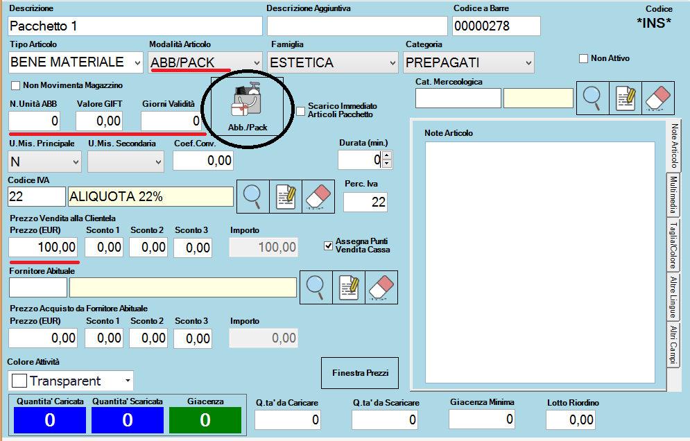 Nel momento in cui si seleziona la sezione abb/pack comparirà nella schermata una nuova sezione (parte sottolineata e cerchiata in rosso), cliccando