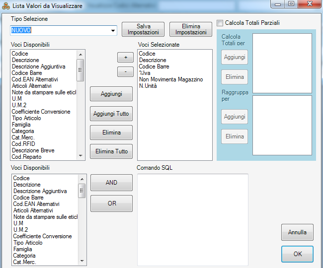 ) il modello in modo da poterlo riutilizzare anche in futuro, quindi prima di caricare la tabella se andremo a scegliere come “Tipo Selezione” quello appena salvato ci verranno mostrate solo le colonne che abbiamo scelto di vedere