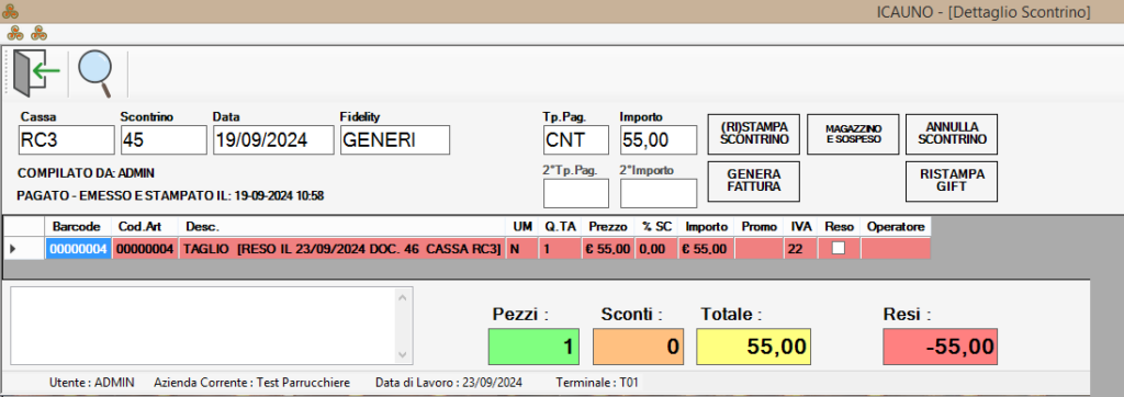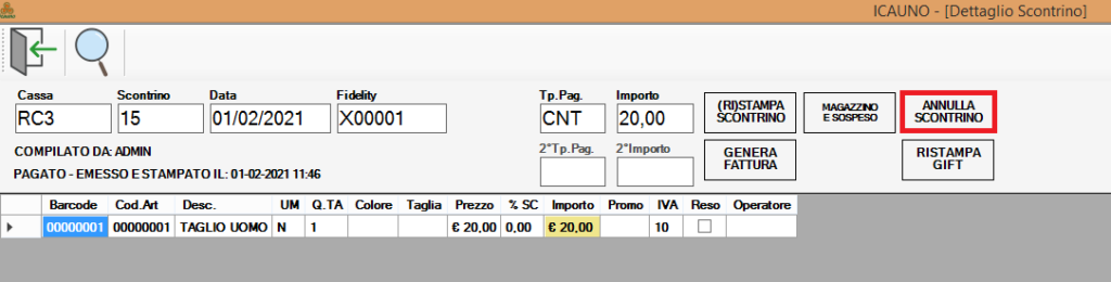 Il risultato sarà questo. Lo scontrino verrà annullato e la macchina fiscale emetterà lo scontrino d’annullo.