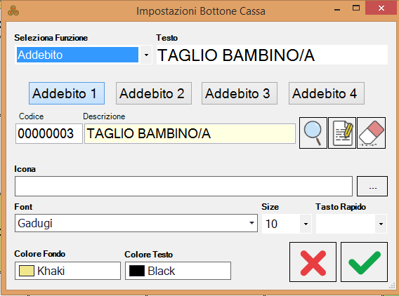 Tramite la funzione “Addebito” potremo inserire in cassa servizi o prodotti offerti, una volta selezionata tale funzione dovremo indicare il codice dell’articolo che desideriamo inserire ed infine dare conferma.