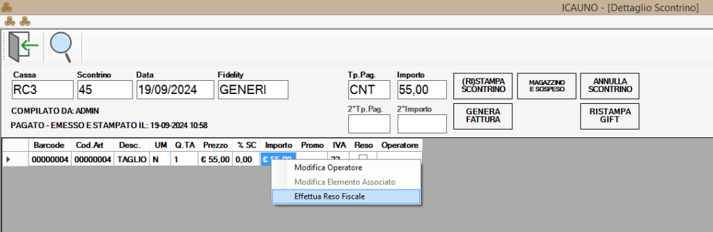 Per effettuare il reso fiscale, è necessario aprire lo scontrino appena emesso, fare clic con il tasto destro del mouse e selezionare ‘Effettua Reso Fiscale’, indicando la quantità degli articoli che si desidera restituire.