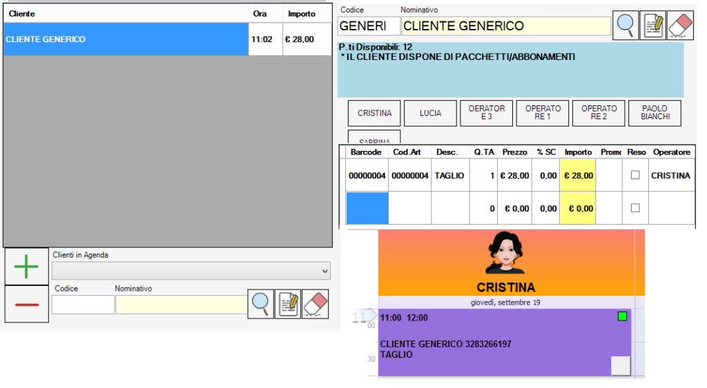 Per importare un cliente dall’agenda con i servizi che richiede bisogna premere il pulsante imp. agenda in questo modo il cliente verrà caricato all’interno della cassa con i servizi segnati all’interno dell’agenda, a questo punto premendo parcheggio, il conto del cliente verrà accantonato