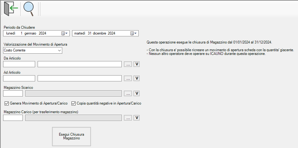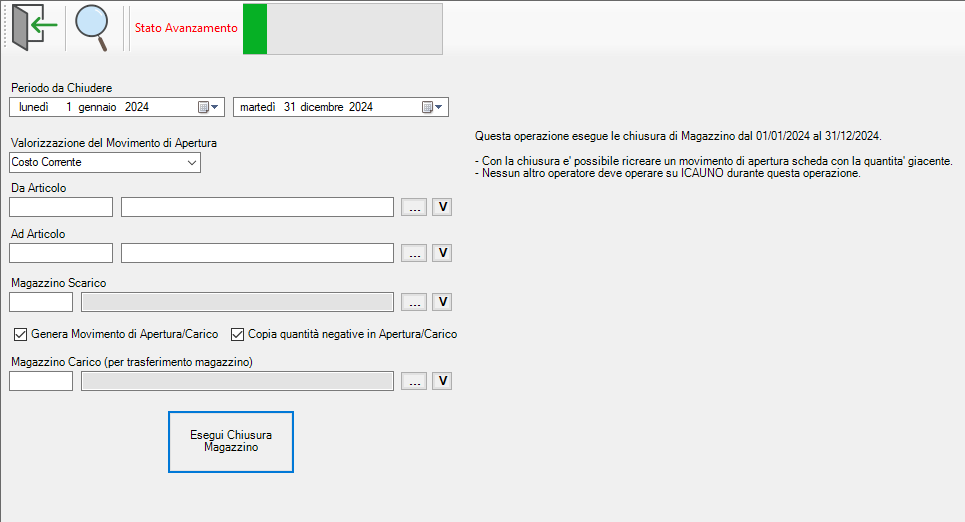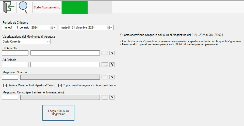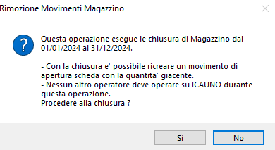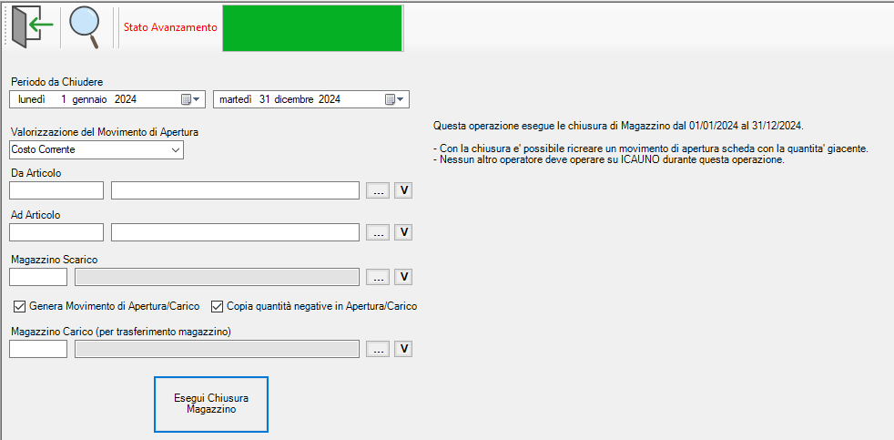 È importantissimo che in questa fase del processo non vengano modificate le giacenze, e quindi non potranno essere caricati o scaricati nessuno tipo prodotto, per evitare che ciò avvenga si dovrà chiedere agli altri utenti collegati, di interrompere l’utilizzo di ICAUNO in questo lasso di tempo.