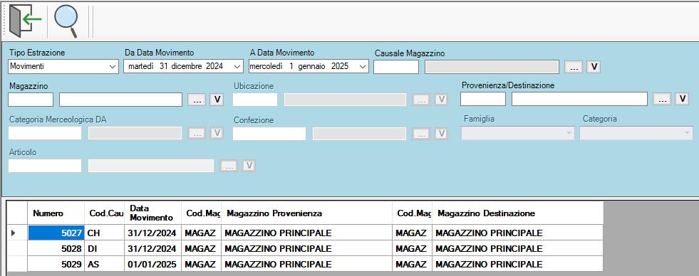 Possiamo verificare le operazione eseguite da iucano andando nell’elenco dei movimenti all’interno della maschera MAGA12 e caricando quelli riguardanti la giornata del 31/12 e del 01/01 potremo vedere che sono stati inseriti due documenti