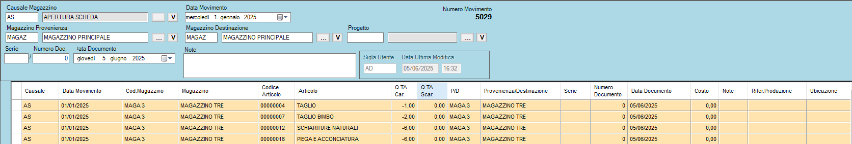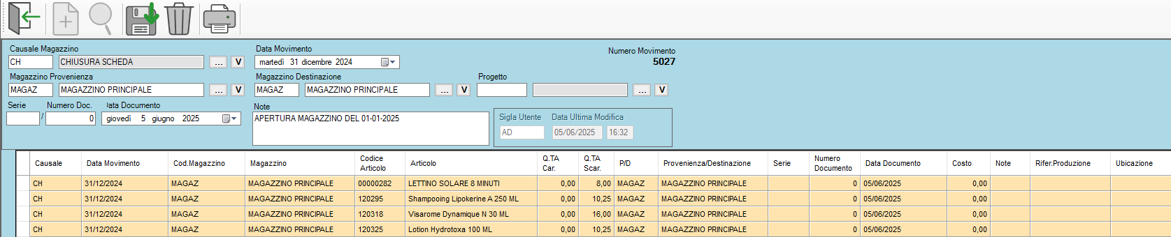 LE QUANTITA’ SONO RIPORTATE NEL MOVIMENTO APERTURA MAGAZZINO DEL 01-01-2025