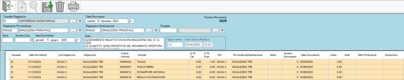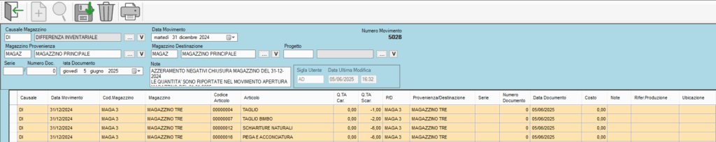N.B: AZZERAMENTO NEGATIVI CHIUSURA MAGAZZINO DEL 31-12-2024