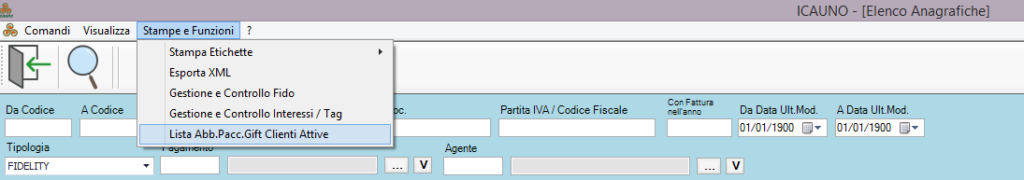 Vi è la possibilità di vedere gli abbbonamenti e le gift card attive e cliccando su Stampe e Funzioni –> Lista Abb. Pacc. Gift Clienti Attive o tramite comando apposito da eseguire CLIABBGIFT01.