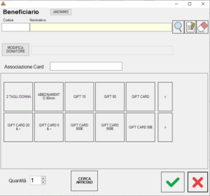 con questo pulsante potremo inserire in cassa i servizi / prodotti offerti, una volta selezionata tale funzione dovremo indicare il codice del articolo che desideriamo inserire infine dare conferma;