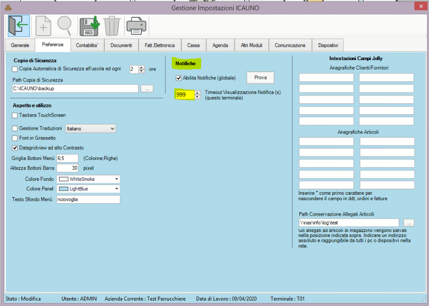 Infine inserire in Timeout Visualizzazione il numero 999 per espandere il range di notifiche al massimo, 0 o togliere il flag Abilita Notifiche se ad un terminale associato non è necessario vedere esse.