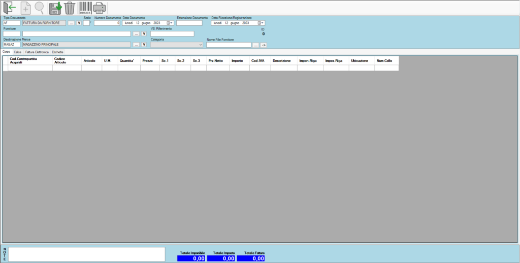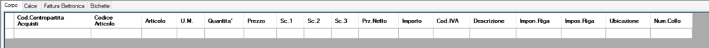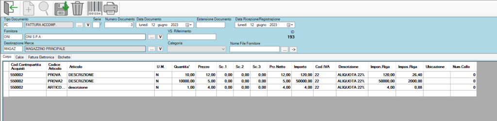 Inserti i campi in testata del documento si potrà passare all’inserimento del corpo del documento, ovvero il dettaglio degli articoli acquistati da caricare in magazzino.