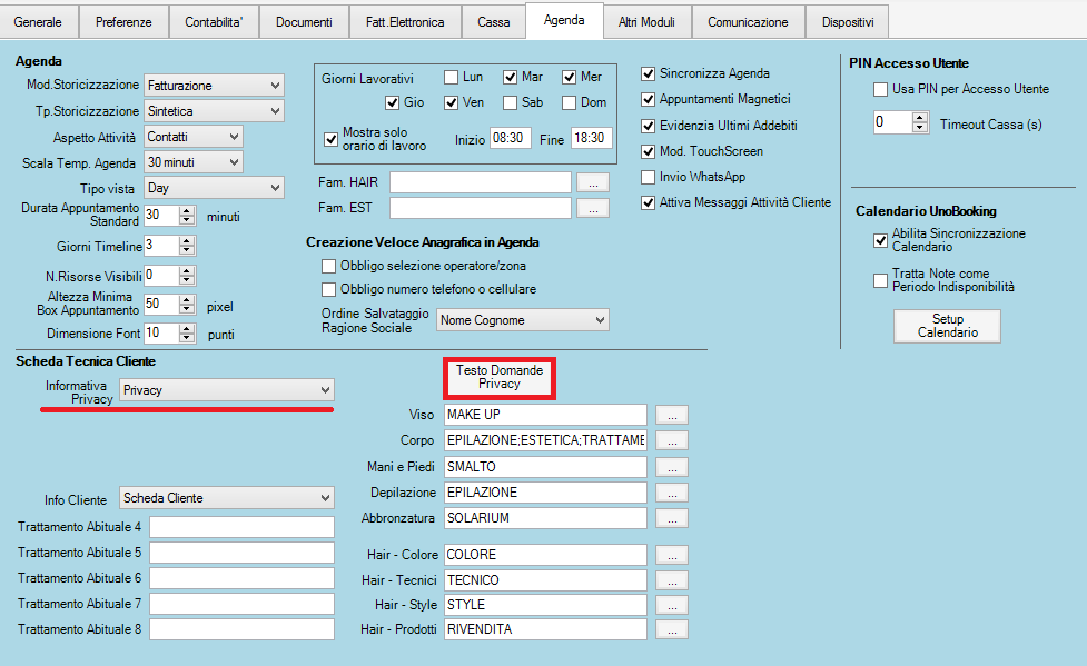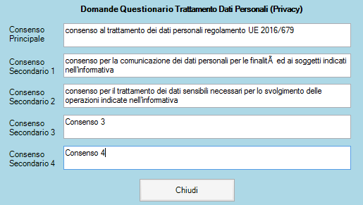 Nella sezione Scheda Tecnica Cliente –> Testo Domande Privacy