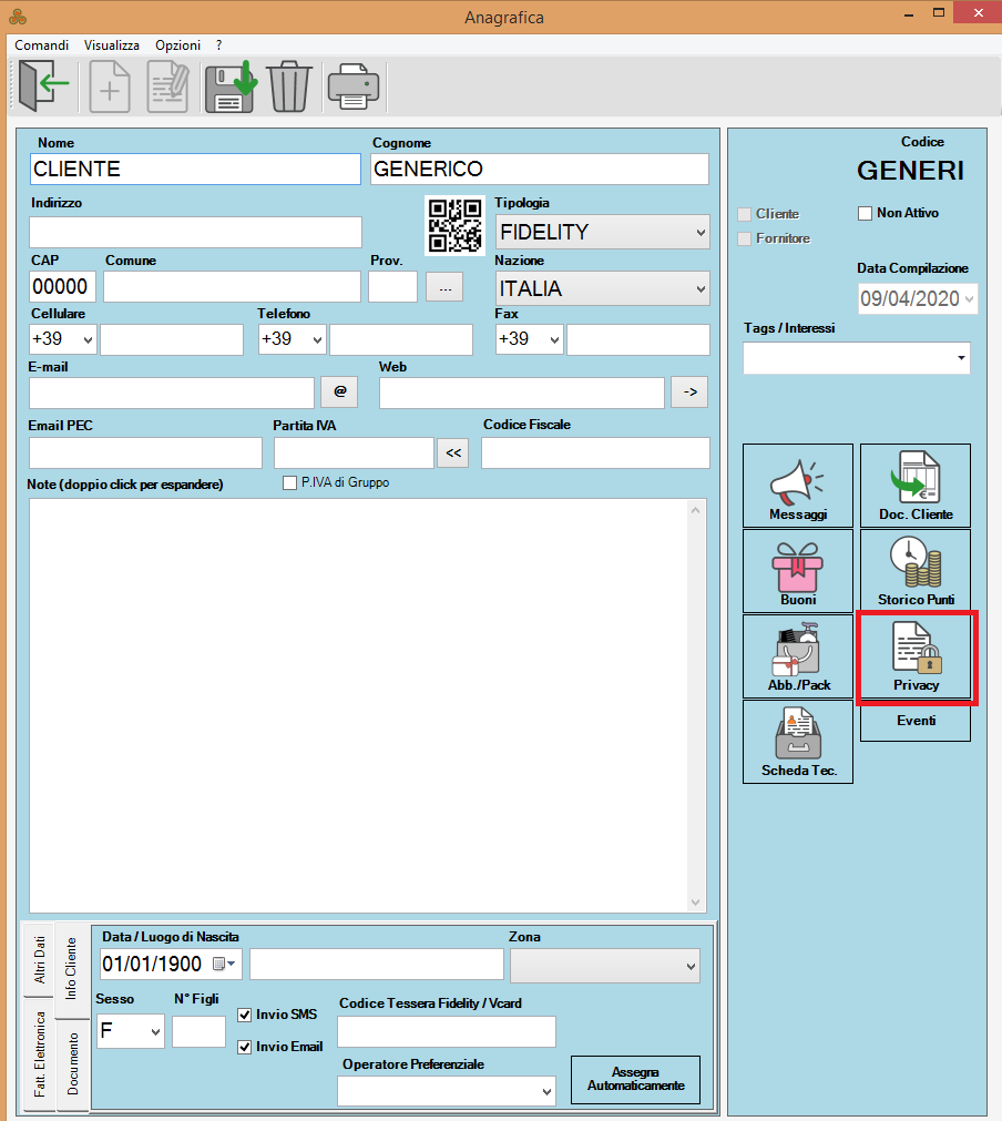 Nella sezione Gestione Anagrafiche, selezionare un cliente. Dopodiché aprire cliccare su Privacy.