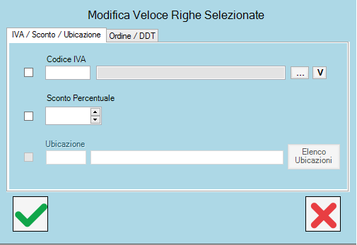IVA / Sconto / Ubicazione all’interno è possibile selezionare il Codice IVA, applicare uno Sconto Percentuale, e l’Ubicazione