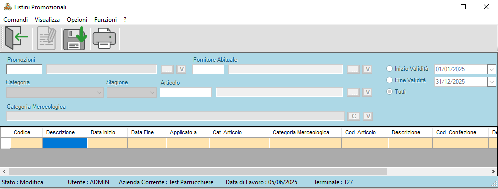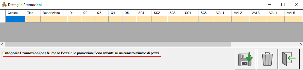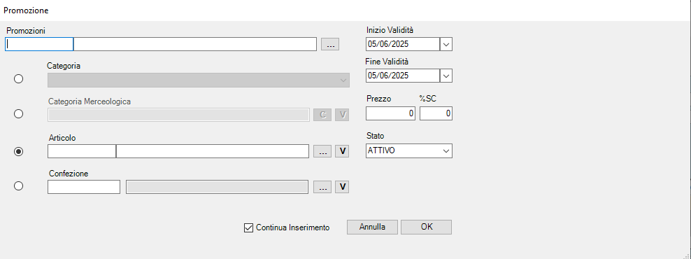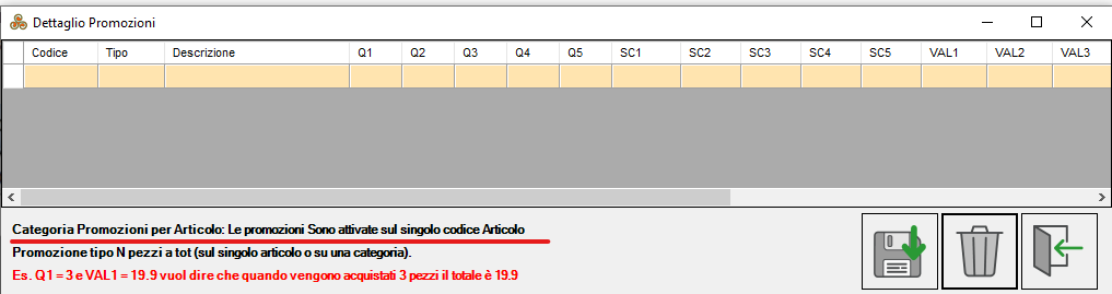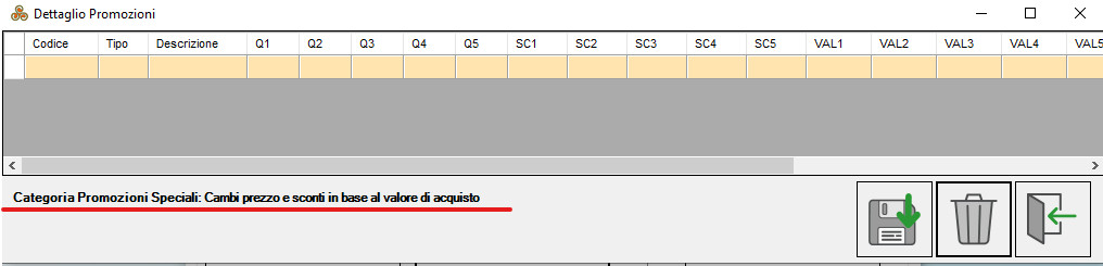 Le promozioni si suddividono in Promozioni per Articolo, per Categoria, per Numero pezzi e Promozioni Speciali. Andando a cliccare su uno di questi pulsanti vedremo che ci verrà presentata una tabella vuota