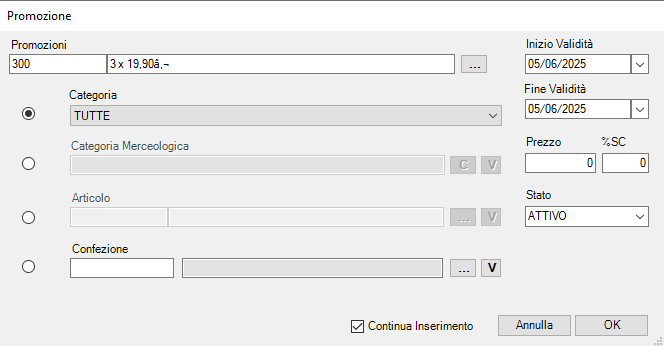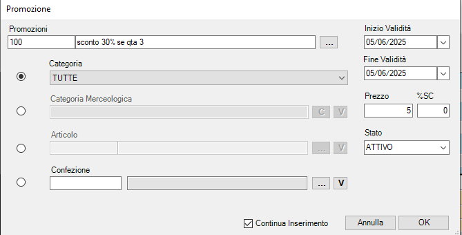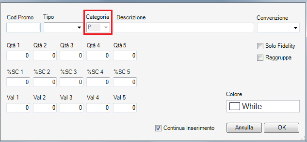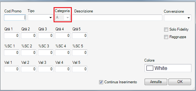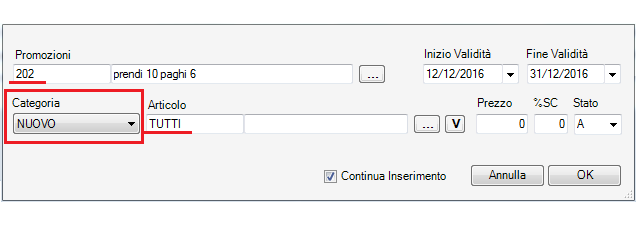 Creando una nuova promozione a seconda del Tipo Promozione (Articolo, Categoria, Numero Pezzi e Speciali) nella quale l’andremo a inserire la categoria sarà già inserita e bloccata