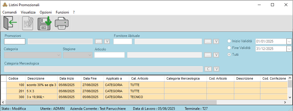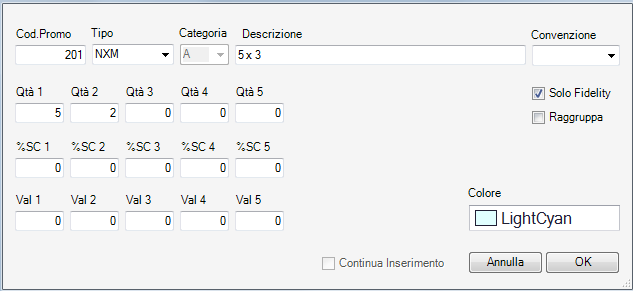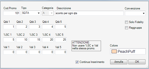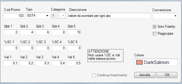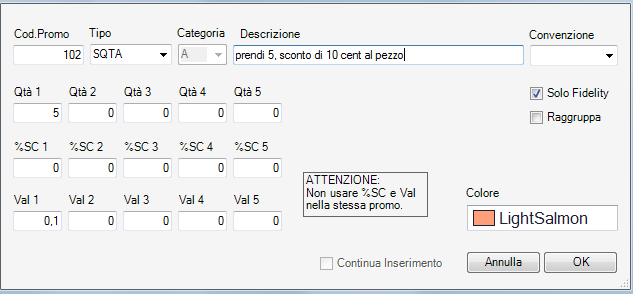 PRZ = questa promo viene utilizzata quando si decide di modificare momentaneamente il prezzo di un articolo indipendentemente dalla quantità acquistata dal cliente, tale promozione funziona solo se creata all’interno di speciali