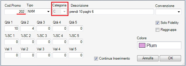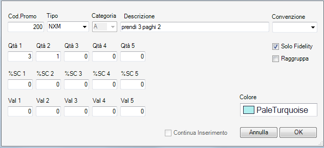 COME CREARLA: dopo aver selezionato come Tipo NXM bisogna inserire in Qtà 1 il numero di articoli che dovranno essere acquistati mentre in Qtà 2 il numero di articoli che verranno dati in omaggio
