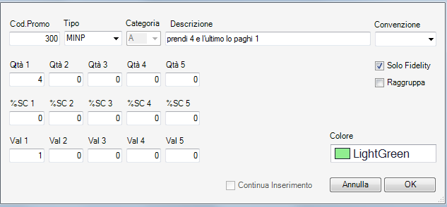 COME CREARLA: dopo aver selezionato come Tipo MINP bisogna inserire all’interno di Qtà 1 il numero di articoli che dovranno essere acquistati e all’interno di Val 1 il costo che verrà applicato a uno di questi articoli