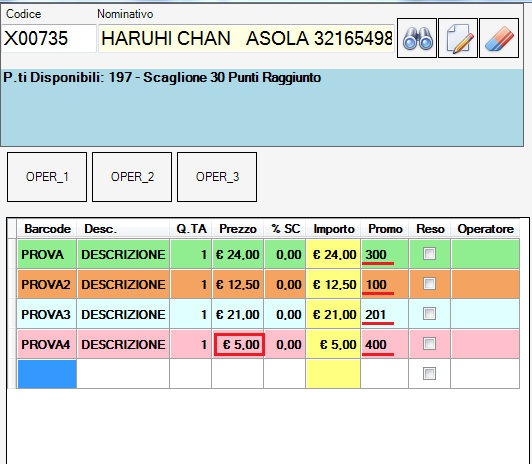 Una volta create le associazioni quando il cliente acquisterà uno dei prodotti collegati alla promo all’interno della cassa verrà visionato il codice e il colore che avremo attribuito a tale promo, se verranno acquistate le quantità adeguate la promo verrà attivata