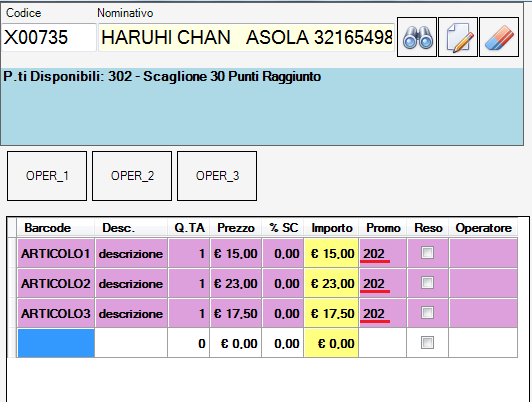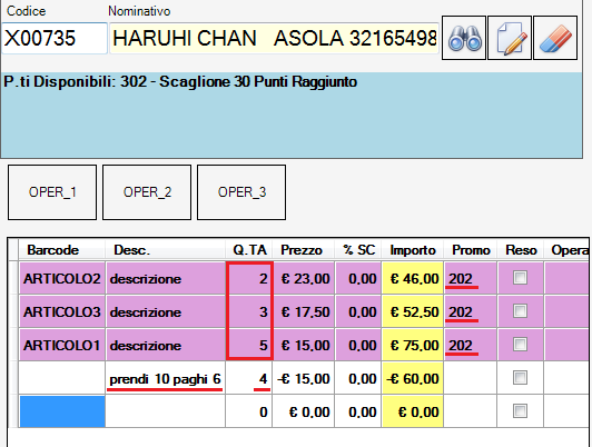 Se andiamo all’interno della cassa, inseriamo i codici dei prodotti che appartengono alla categoria “NUOVO” e indichiamo le quantità minime della promo vedremo che essa verrà attivata