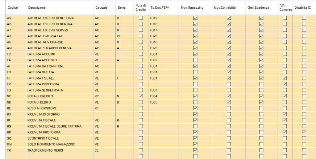 mentre la tabella caricata cliccando “Tipo Fattura” riporta i tipi di documenti presenti nella maschera FORN01X